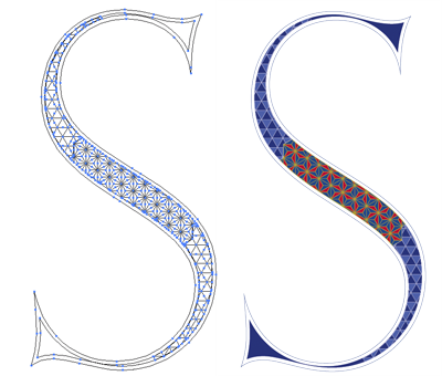 We'll start in Illustrator where we can make the basic shapes. The design has three fundamental shapes, the letter 'S', the tessellation inside the S, and the spiral ornaments. The S is from ITC's Golden Cockerel Initials and Ornaments typeface. The tessellation is a bit trickier. There are number of ways to do this in Illustrator. I used Nodebox which allows one to describe bezier paths with python that can be pasted into Illustrator. If that's not your thing, Tessella, an Illustrator plugin from Stephen Vincent, makes these sort of things very easy. The basic idea is to make the tessellation, then use a skinny version of the letter (effects->path->offset path… will help with making fat and skinny letters) to mask out the parts you don't want. Add a stroke to the normally-sized letter and you're done.